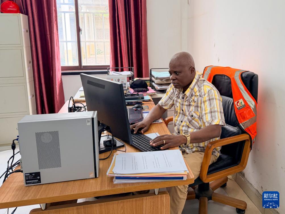 1月24日,在刚果(布)布恩扎省,刚果(布)新水泥厂技能副经理菲代勒·翁东戈在办公室内作业。新华社发